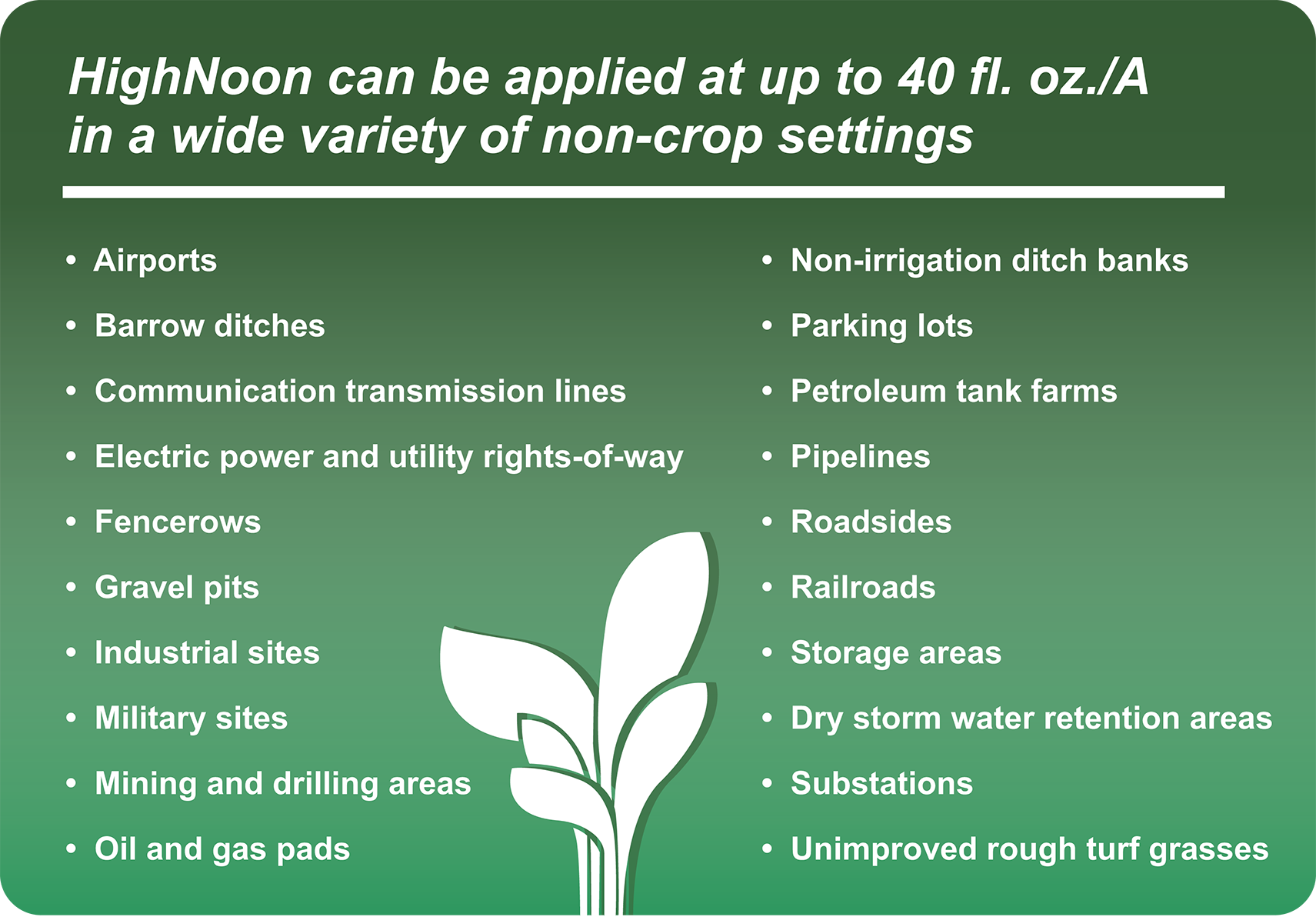 HighNoon is also a reduced-risk herbicide that is low-odor and virtually nonvolatile. It has no grazing restrictions and it poses reduced risks to applicators, livestock, fauna, consumers and the environment. This can make it a great choice for vegetation managers serving a diverse set of stakeholders who may have concerns about what’s being applied on their land or in their community.