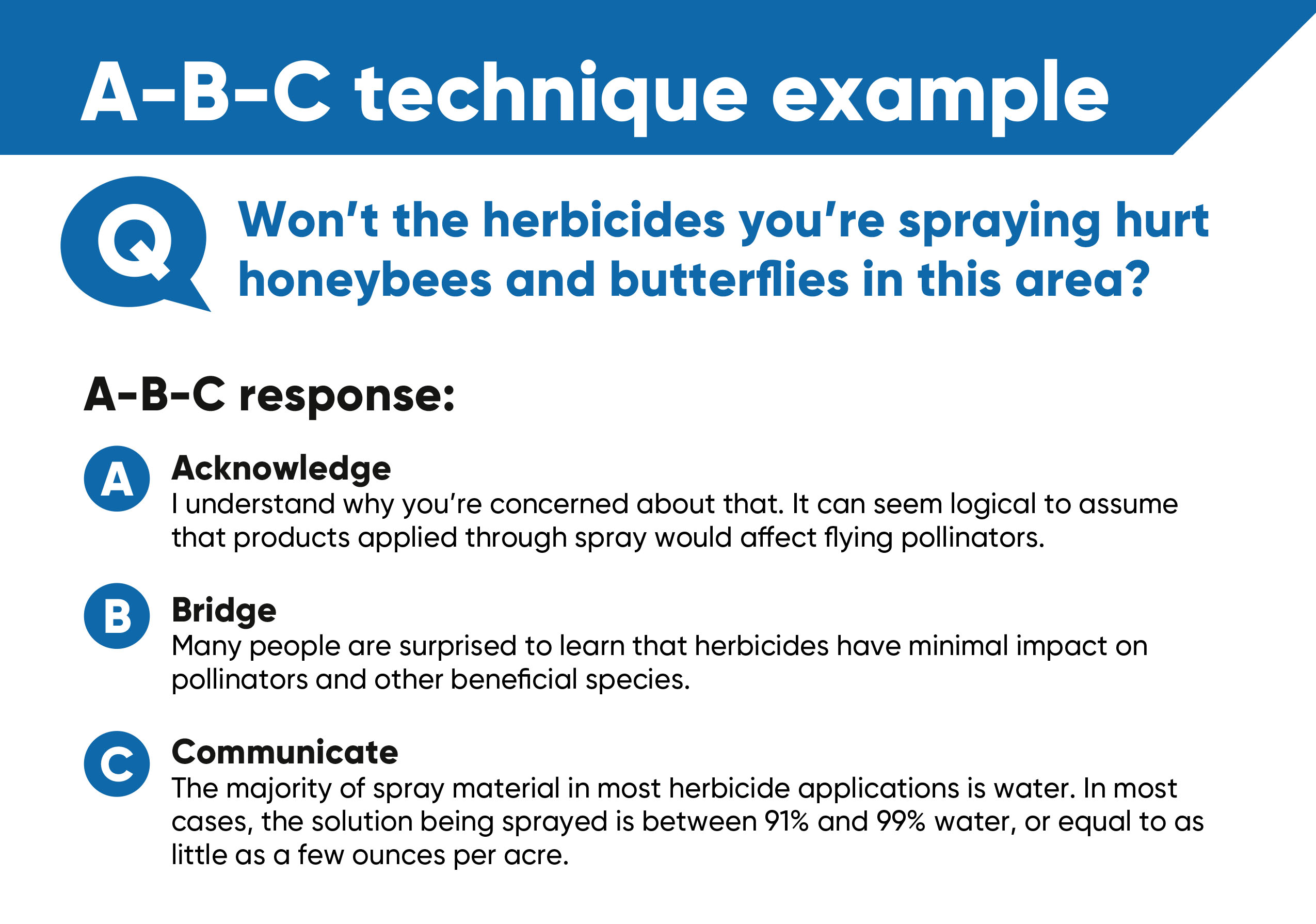 It can be easy to find yourself caught off guard or even on the defensive when someone questions what you’re doing, especially if they express concern. However, moments like these can also be a great opportunity to help educate the public about integrated vegetation management (IVM), herbicide safety and how the work you’re doing will ultimately benefit the landscape. While you may already be an expert on these topics, how you communicate that expertise can make all the difference in improving public understanding and relationships with communities. Here are some tips to keep in mind.